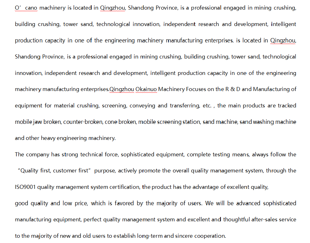 山東奧凱諾機械坐落于山東青州,是一家專業從事礦山破碎、建筑破碎、塔樓制砂、科技創新、自主研發、智能化生產能力于一體的工程機械制造企業。青州奧凱諾機械專注于物料破碎、篩分、輸送、轉運等設備的研發與制造,主要產品有歐版鄂破,歐版反擊破;圓錐破,歐版給料機,歐版水平篩,歐版斜篩,履帶式破碎站,履帶式篩分站等大型礦山機械。